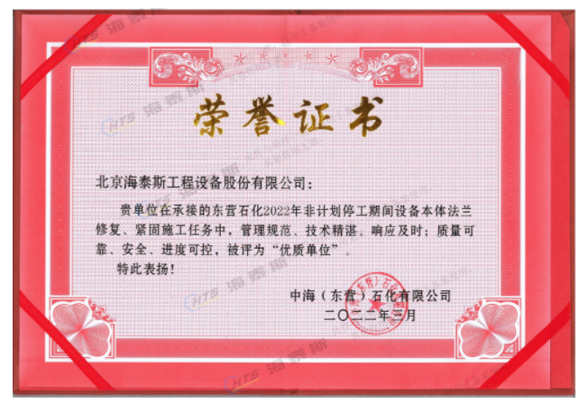 海泰斯獲評“優(yōu)質(zhì)單位”!負責(zé)的催化裝置、常減壓裝置泄漏法蘭的在線修復(fù)和定力矩緊固施工任務(wù),實現(xiàn)了“零泄漏”的目標。